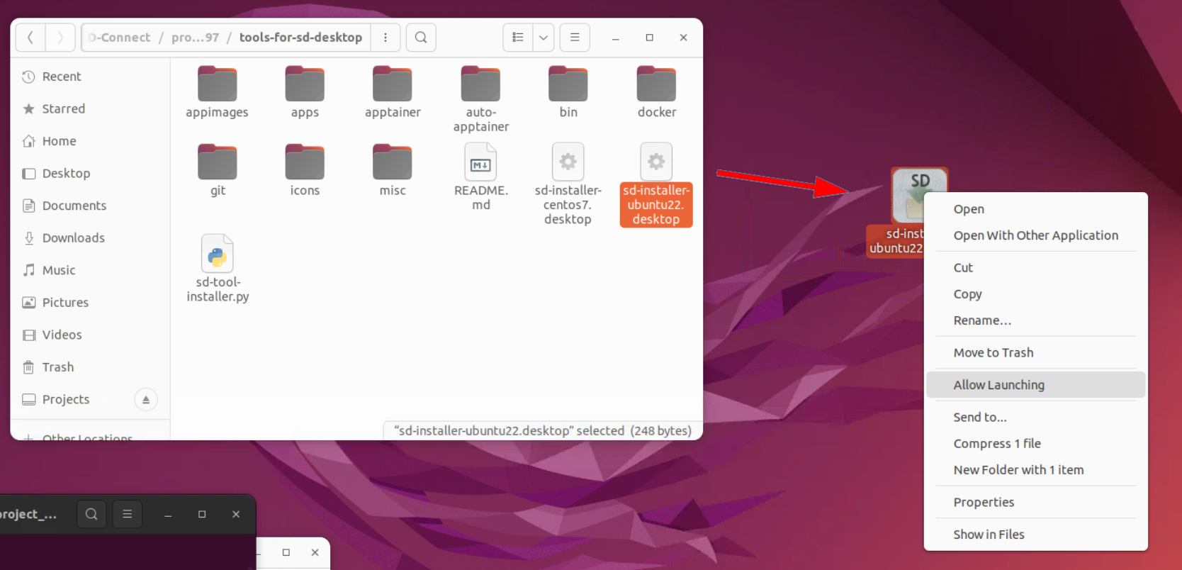 tools-for-sd-desktopja vedä/kopioi sieltä tiedostosd-installer-centos7.desktoptaisd-installer-ubuntu22.desktoptyöpöydällesi. Valitse versio, joka vastaa SD Desktopisi käyttöjärjestelmää (esim. Ubuntu).