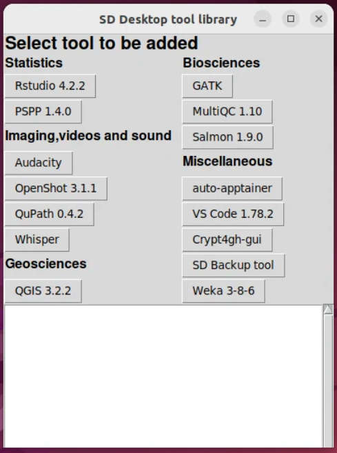 Virtuaalityöpöydällä on valmiiksi asennettuna joukko perustyökaluja ja ohjelmistoja, joita voit käyttää heti (lueteltu alla). Tämä alkuperäinen työkalupaketti sisältää kuitenkin melko rajallisen valikoiman avoimen lähdekoodin ohjelmistoja. Voit muuttaa virtuaalityöpöydän monipuoliseksi tutkimustyötilaksi omiin tarpeisiisi sopivaksi käyttämällä yksinkertaista SD Software Installer -sovellusta, joka auttaa ohjelmistojen lisäämisessä ja virtuaalityöpöydän mukauttamisessa. Teknisesti kokeneille käyttäjille on myös mahdollista luoda mukautettuja kontteja Apptainerilla tai Podmanilla.