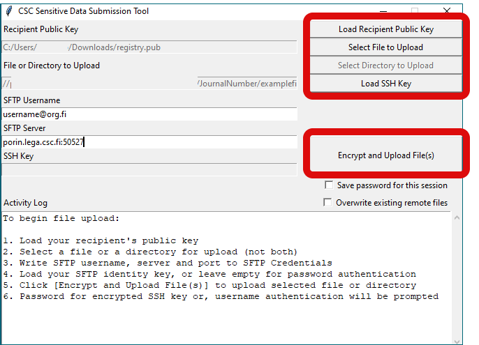 Tämä SDA (Sensitive Data Archive) Uploader -työkalu on saatavilla GitHubissa myös komentorivikäyttöliittymäversiona (CLI, vaihtoehto 1 alla) Linuxille, Macille ja Windowsille. Lisätietoja työkalusta on GitHub-repositoriossa. Vaihtoehtoisesti voit salata datan Crypt4GH:lla (myös GUI saatavilla, vaihtoehto 2 alla) ja lähettää datan suoraan SFTP:llä komentorivillä. Jokaisessa vaihtoehdossa sinun täytyy käyttää CSC:n julkista rekistereille tarkoitettua salausavainta tiedostojen salaamiseen. Tämä avain on erillinen SSH-avaimistasi.