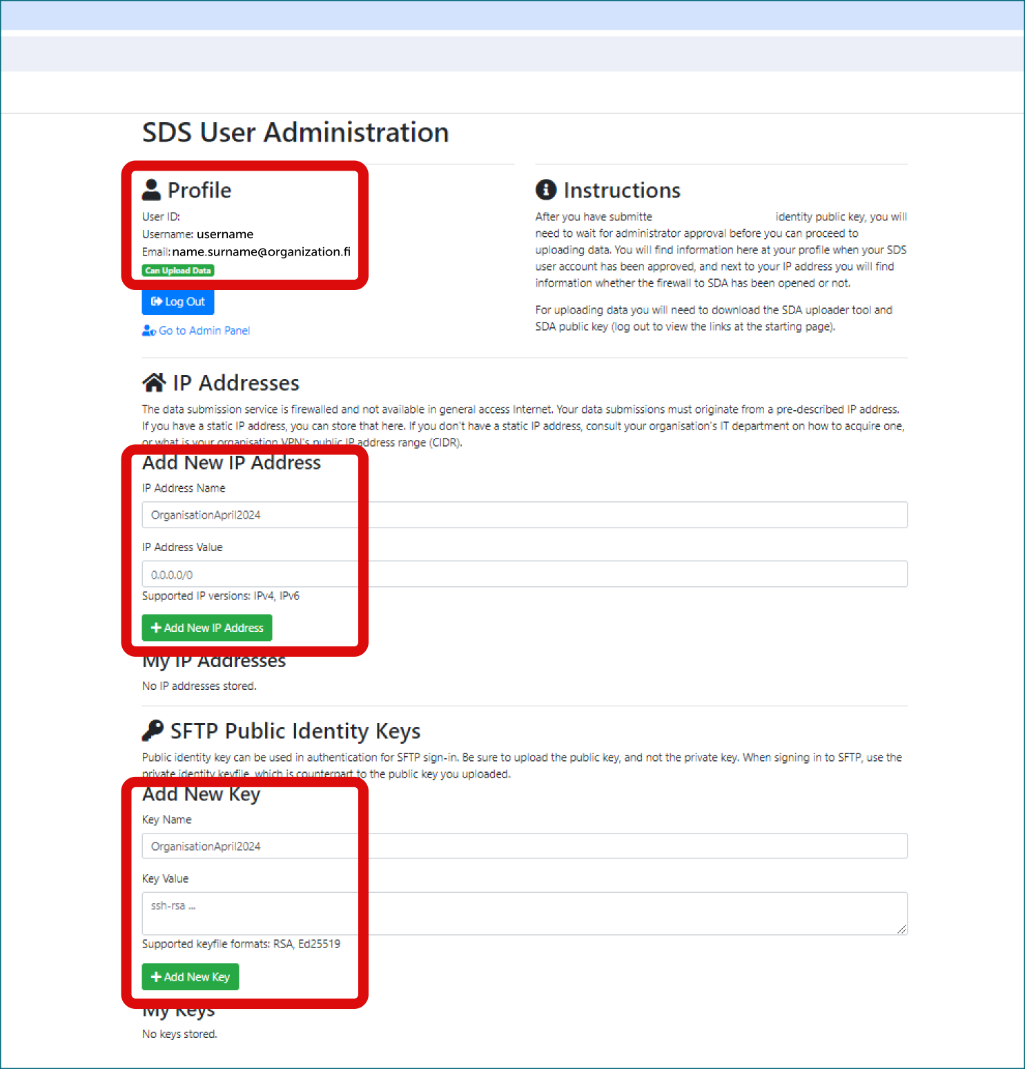 Lisää IP-osoite, josta data siirretään, sekä sille määritelty nimi (esim. organisaatio-päivämäärä). IP-osoitteen voi tarkistaa CSC:n My IP -sovelluksella.