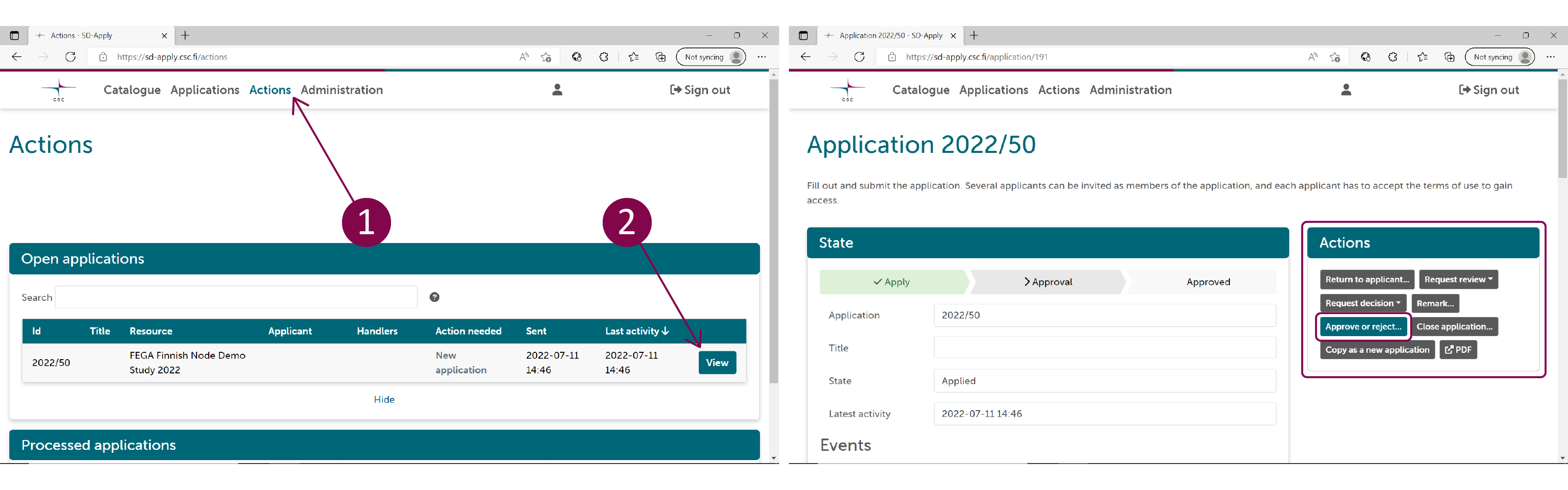 Siirry SD Applyssa "Actions"-välilehdelle nähdäksesi kaikki hyväksyntää odottavat hakemukset. Valitse View avataksesi hakemuksen, jonka haluat käsitellä.